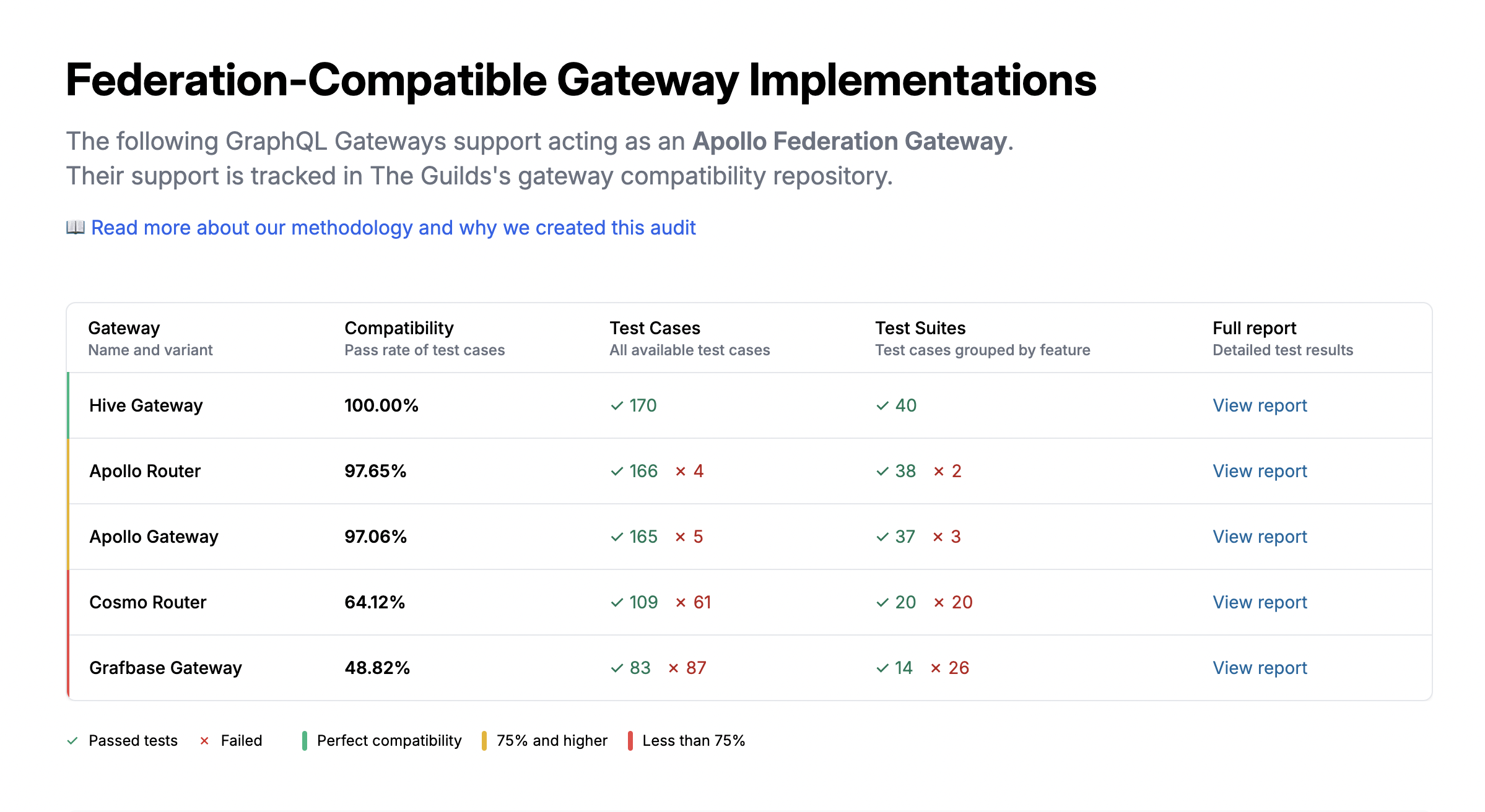 We want to turn our effort into helping potential users of GraphQL gateways to better understand what Apollo Federation support means, but also the maintainers of those gateways to improve their score and learn from our experience.